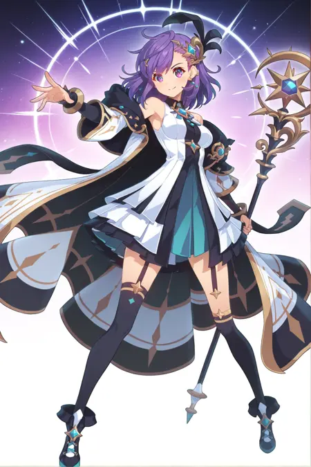 purple eyes, purple hair, medium hair, hair ornament, earrings, bare shoulders, medium breasts, layered dress, white dress, inner black dress, detached sleeves, magician robe, mismatch thighhigh, asymmetrical thighghigh, footwear