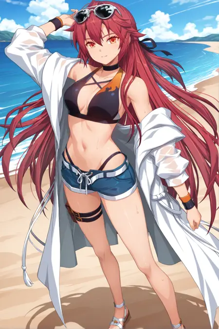 amber eyes, red hair, long hair, choker, black bikini, cross-laced clothes, small breasts, wristband, blue shorts, white belt, highleg bikini, thigh strap, sandals