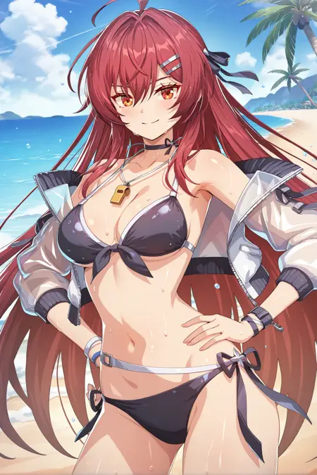 amber eyes, red hair, ahoge, hairband ribbon, long hair, hair clips, choker, whistle around neck, medium breasts, black bikini, stomach strap, white see-through cropped jacket, wristband, single thigh strap, black sandals
