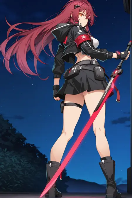 amber eyes, red hair, long hair, hair ornament, medium breasts, black jacket with hood, open jacket, armband, white sports bra, navel, midriff, fingerless black gloves, black skirt, pouch on waist, thigh strap, black boots, hood down