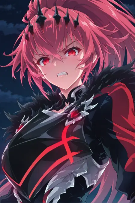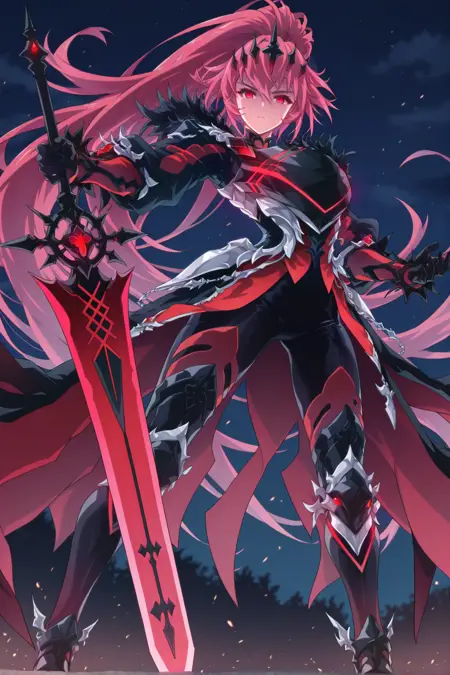 red eyes, red hair, very long hair, high-ponytail, black hair ornament, fur trim, black chest armor, full-bodysuit, black gloves, footwear