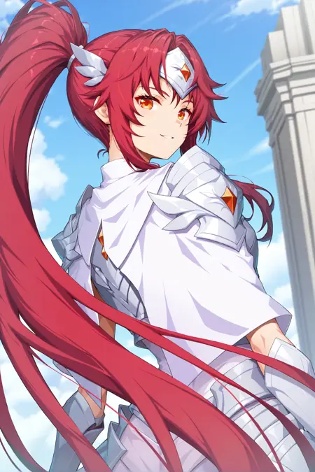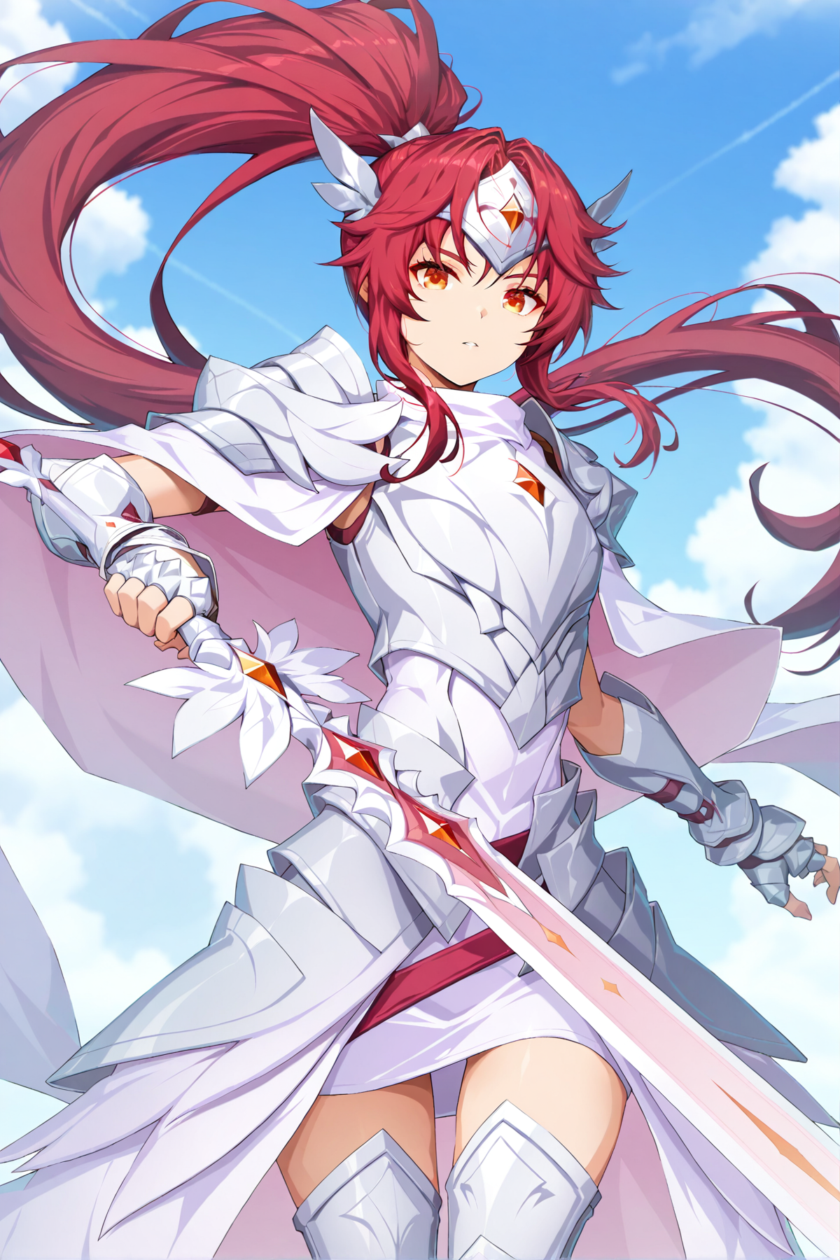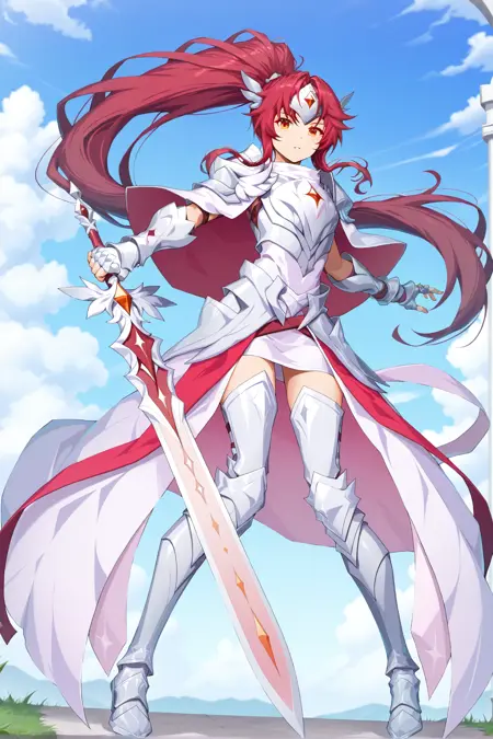 amber eyes, red hair, very long hair, ponytail, forehead protector, capelet, breastplate, shoulder guard, white dress, bracer, fingerless gauntlets, waist guard, waist cape, zettai ryouiki, thigh armored boots