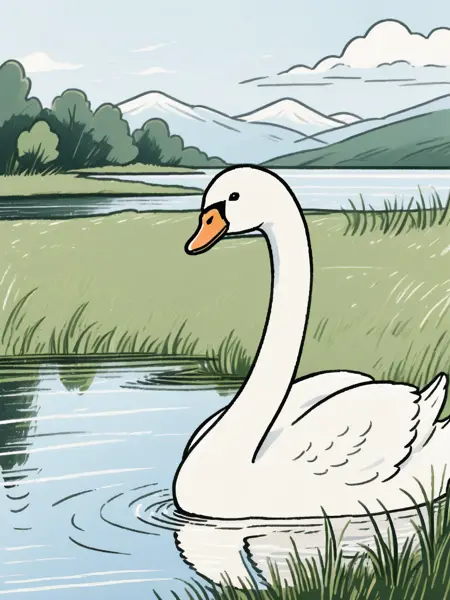 A white swan, raising its head, on the lake, with grass by the lakeside, a simple sketch with thick lines, high-definition, fine details, mid-shot.