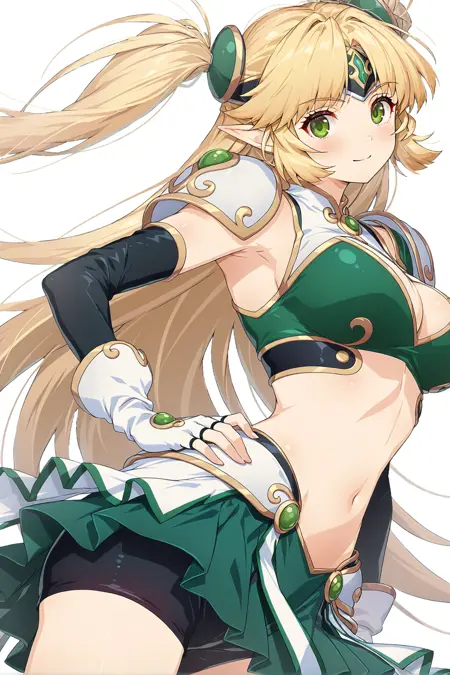 pointy ears, green eyes, blonde hair, long hair, long twintails, hair ornament, forehead protector, cleavage, white neck dress, green shirt, shirt cutout, white shoulder guard, single black sleeves, fingerless white gloves, crop top, navel, green skirt, black shorts, asymmetrical black thighhigh, shoes