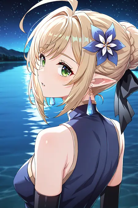 green eyes, pointy ears, ahoge, blonde hair, hair-bun on back tied with hairbow, hair flower, earrings, cleavage, short blue dress, dress cutout, elbow gloves, thighs, single thighhigh, single thigh strap, waist veil, black high heels