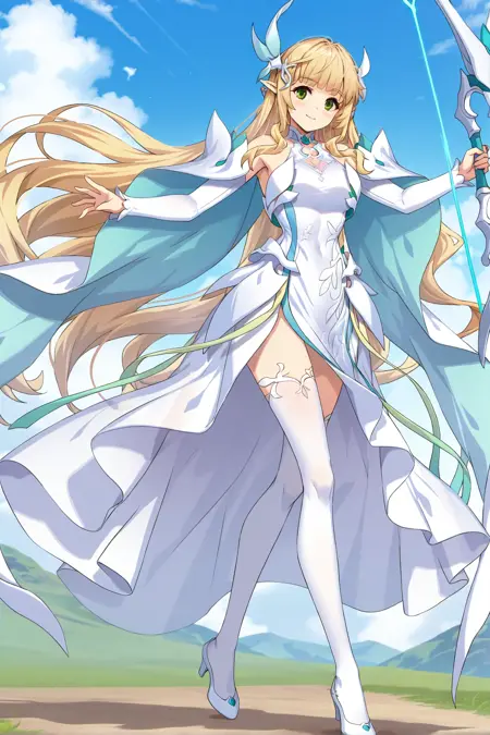 green eyes, blonde hair, pointy ears, sidelocks, very long hair, hair ornament, bare shoulders, white dress, shoulder cape, long sleeves, white thighhigh, waist cape, white high heels