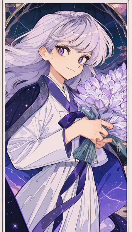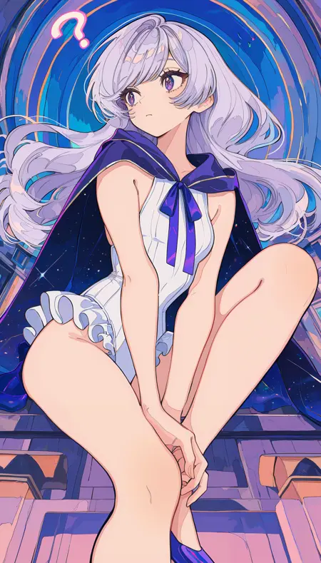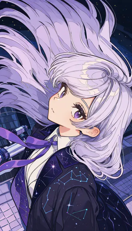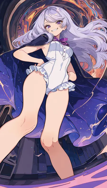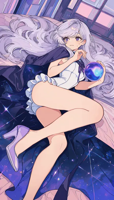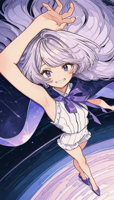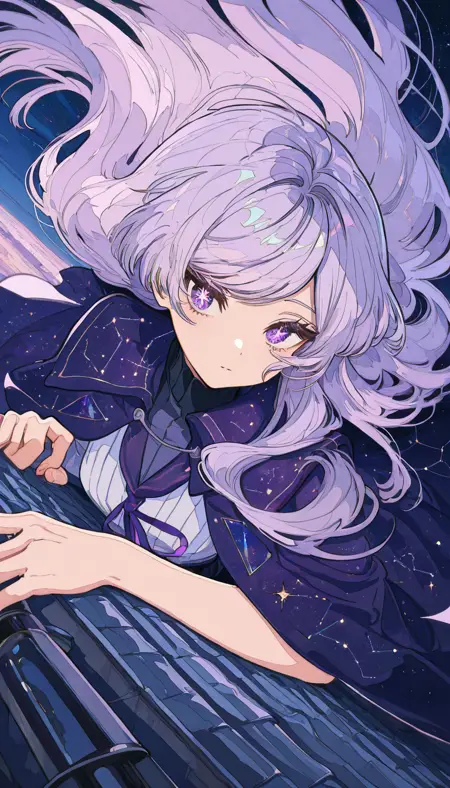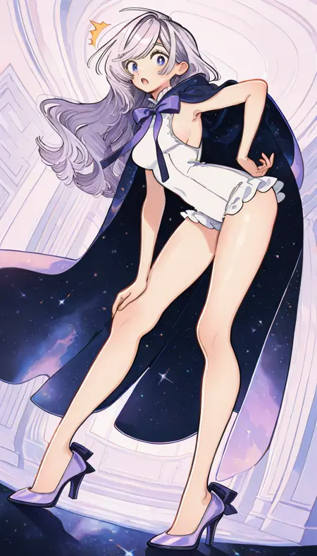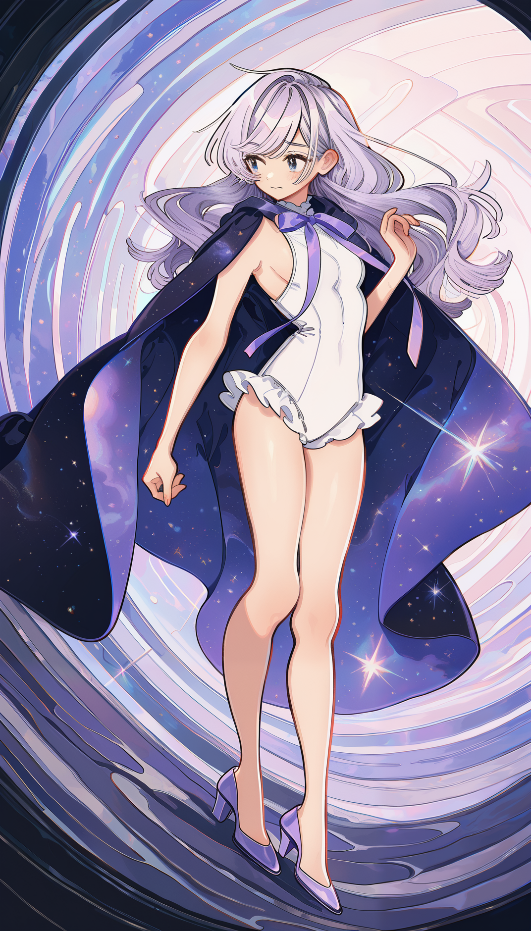 - Side-swept bangs,long hair, pajamas, light purple hair, ribbon tie, purple high heels, cosmic cape, sleeveless,