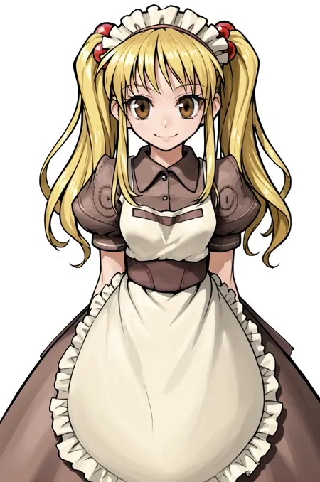curly, blonde hair, twintails, brown eyes, hair ornament, hair bobbles, long hair,