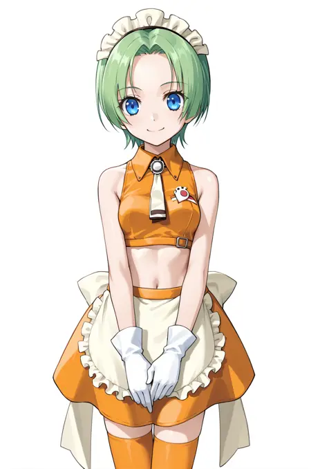 kafra, gloves, midriff, short necktie, orange miniskirt, maid headdress, bare shoulders, orange shirt, collared shirt, crop top, wrist cuffs, apron,