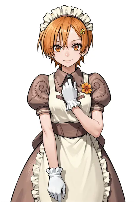 roxie, orange hair, orange eyes, flower hairclip, very short hair,