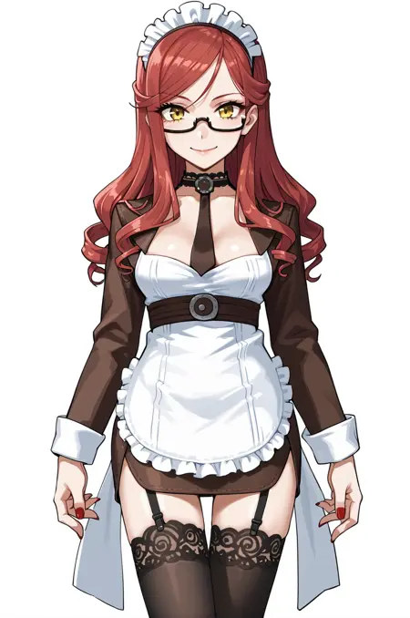 lyrith, glasses, yellow eyes, long hair, nail polish, red hair, curly hair, semi-rimless eyewear, swept bangs,
