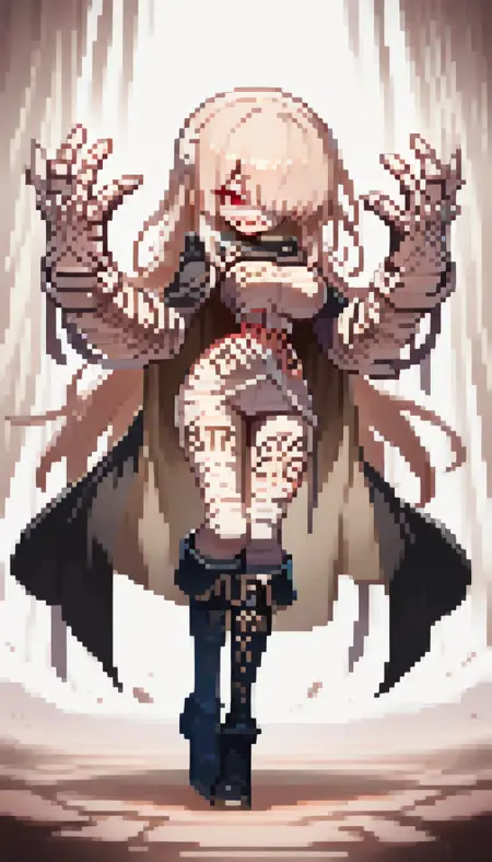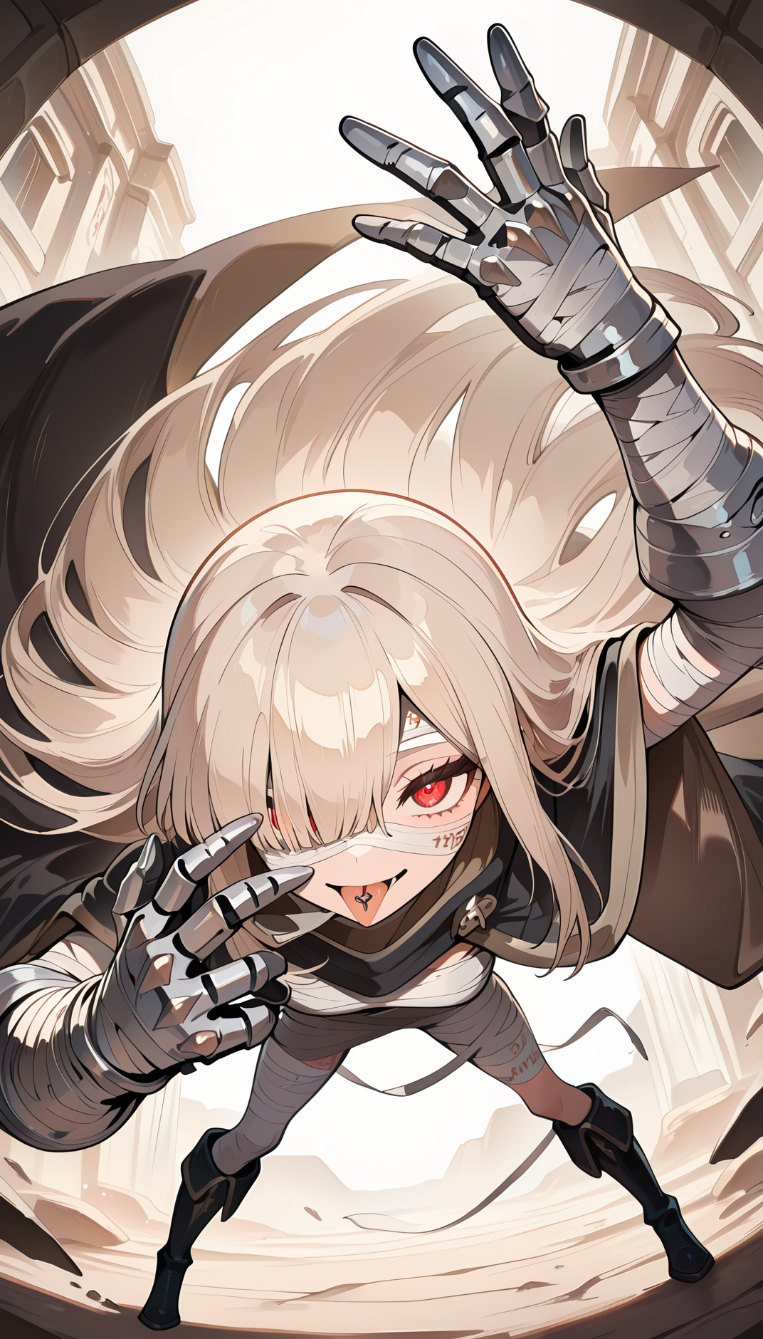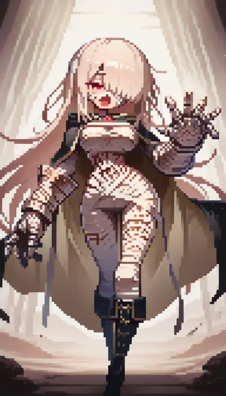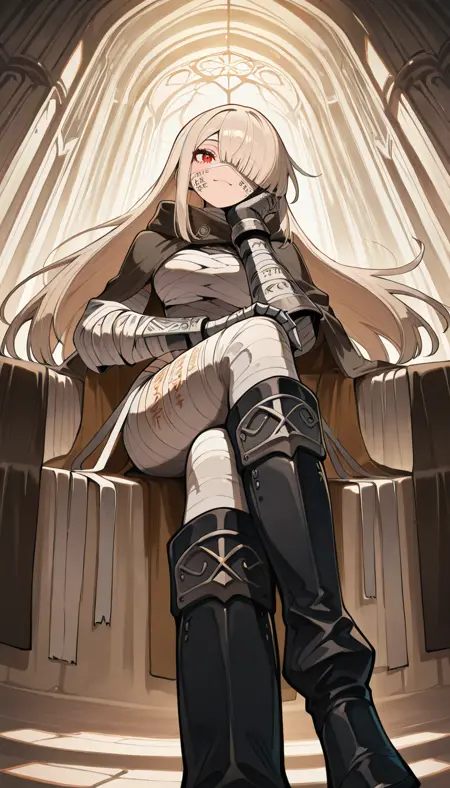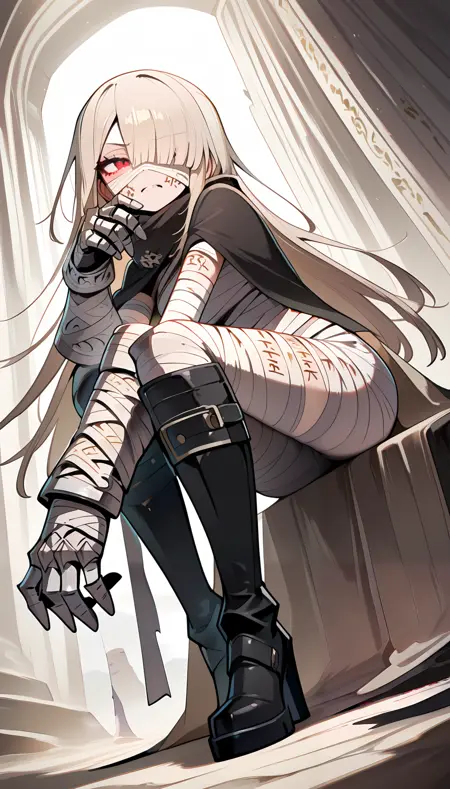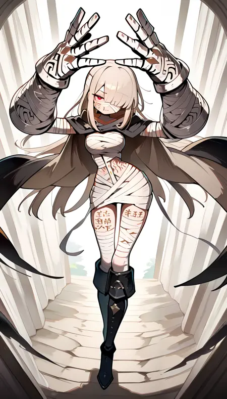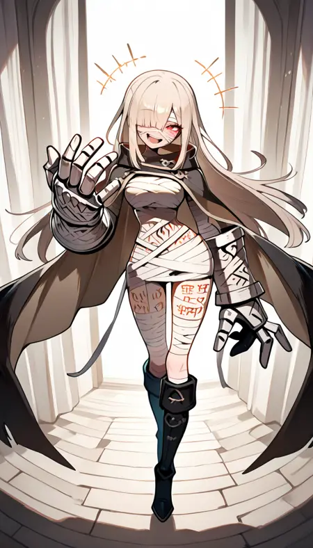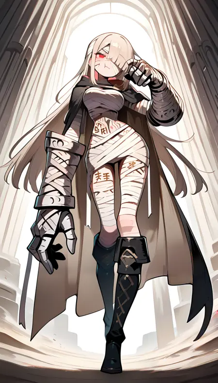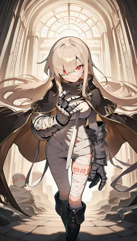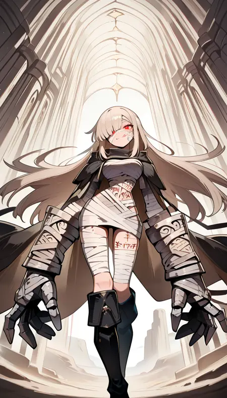 ミイラ服, 茶色の髪, まっすぐなロングヘア, 巨大なガントレット, 黒いマント, 茶色の内側のマント, 赤い目, 黒い膝ブーツ, 包帯で巻かれたガントレット, 体に書かれた文字, タトゥー,