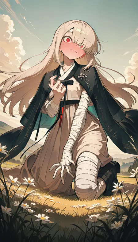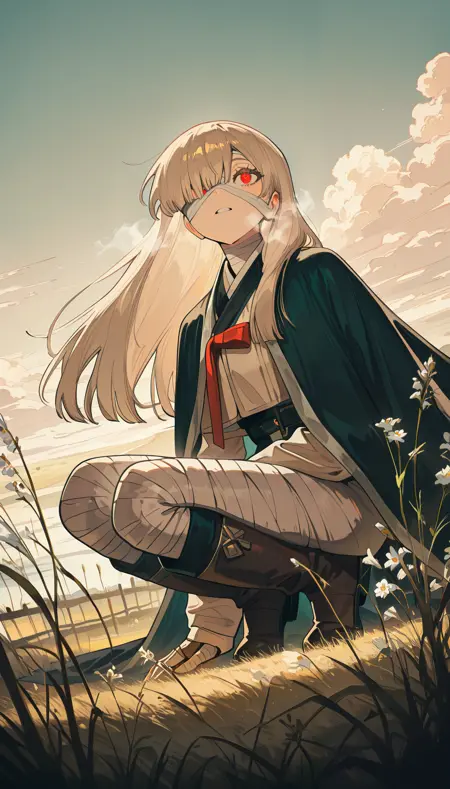 カーテンバング, 片目に髪がかかる, 顔に包帯, 包帯で巻かれた,