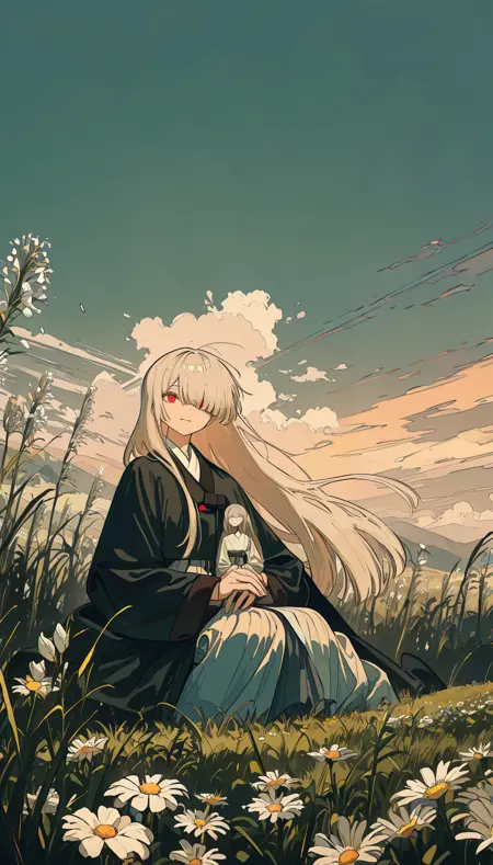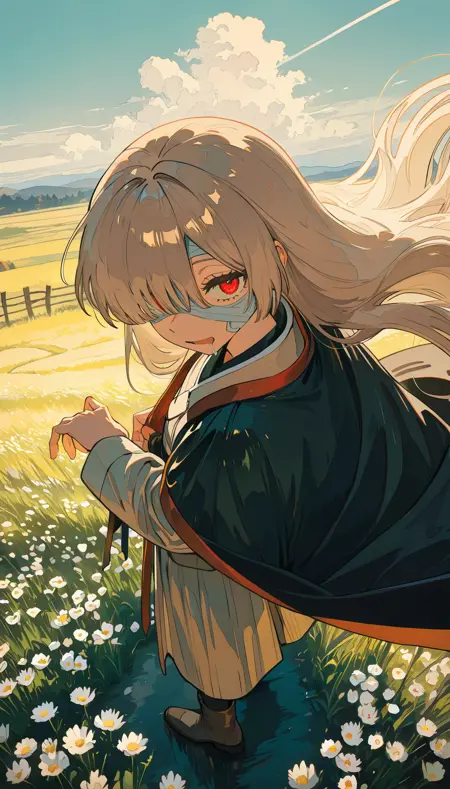 커튼 앞머리, 한쪽 눈을 가린 머리, 얼굴에 붕대 감김, 전체적으로 붕대에 싸임,