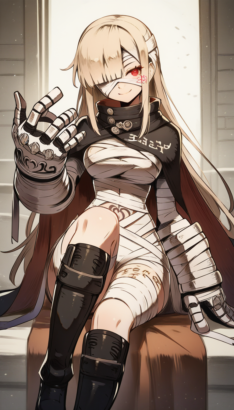 미라 복장, 베이지색 머리카락, 곧고 긴 머리, 거대한 장갑, 검은 망토, 갈색 안쪽 색상의 망토, 빨간 눈, 검은 무릎부츠, 붕대 감긴 장갑, 몸에 쓰인 글자, 문신,