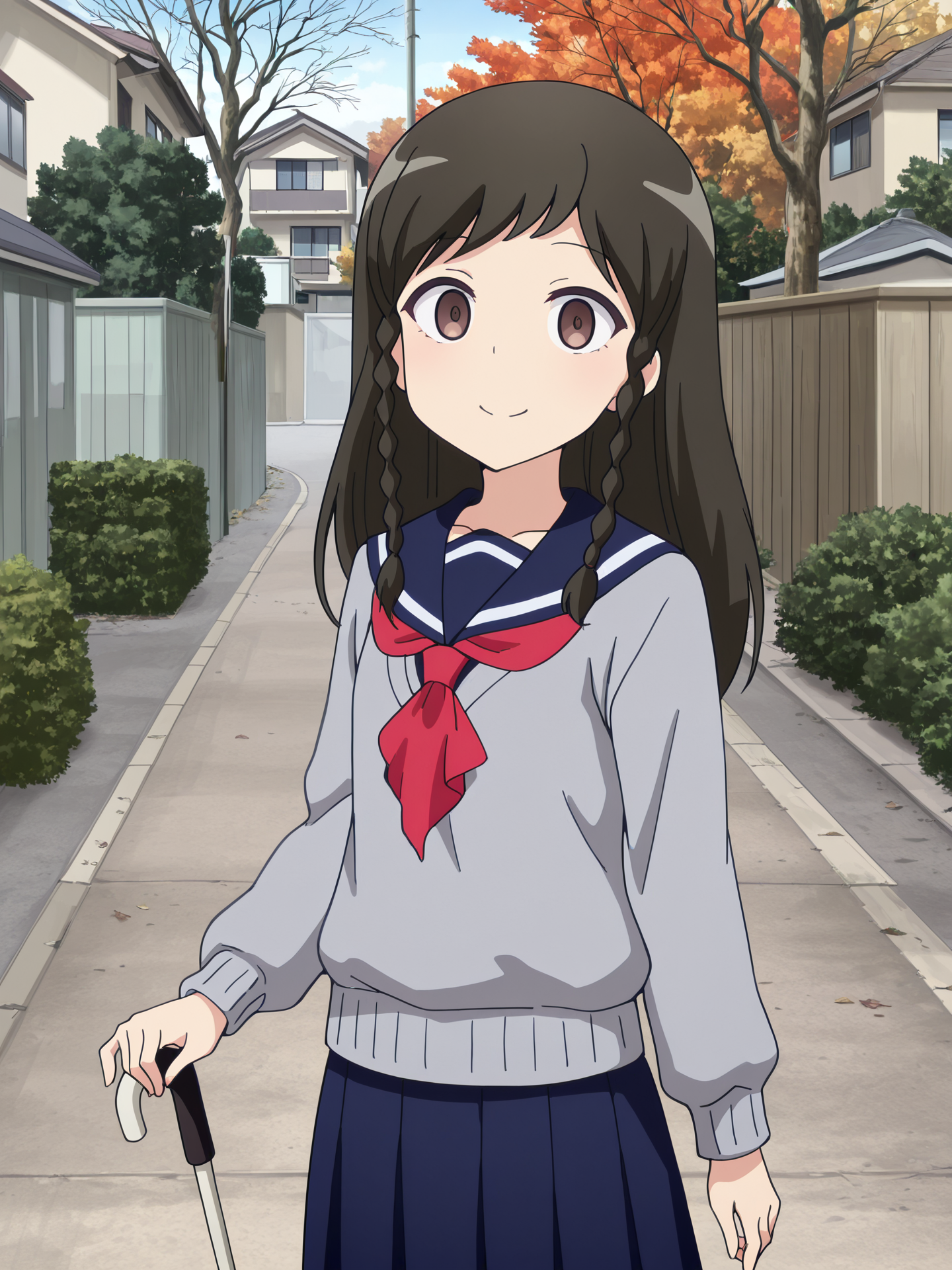 青いシャツ、青いセーラー collar、赤いネッカチーフ、グレーのセーター、長袖、青いスカート、白い靴下、盲人用の銀製のつえ