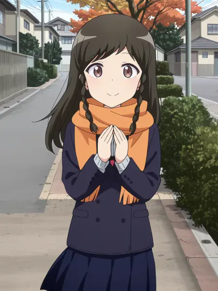 青いブレザー、オレンジのスカーフ、長袖、青いスカート、白い靴下