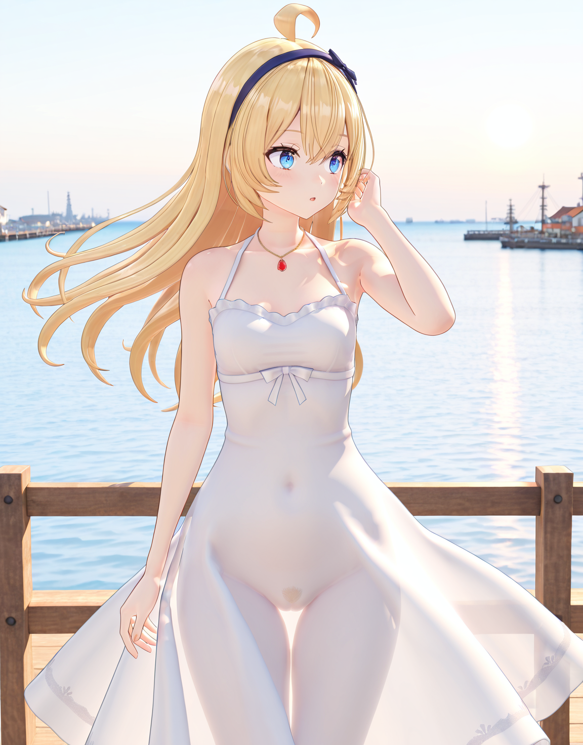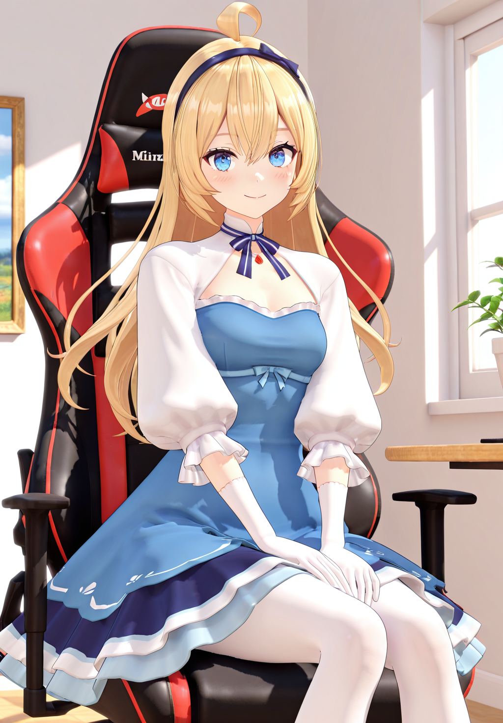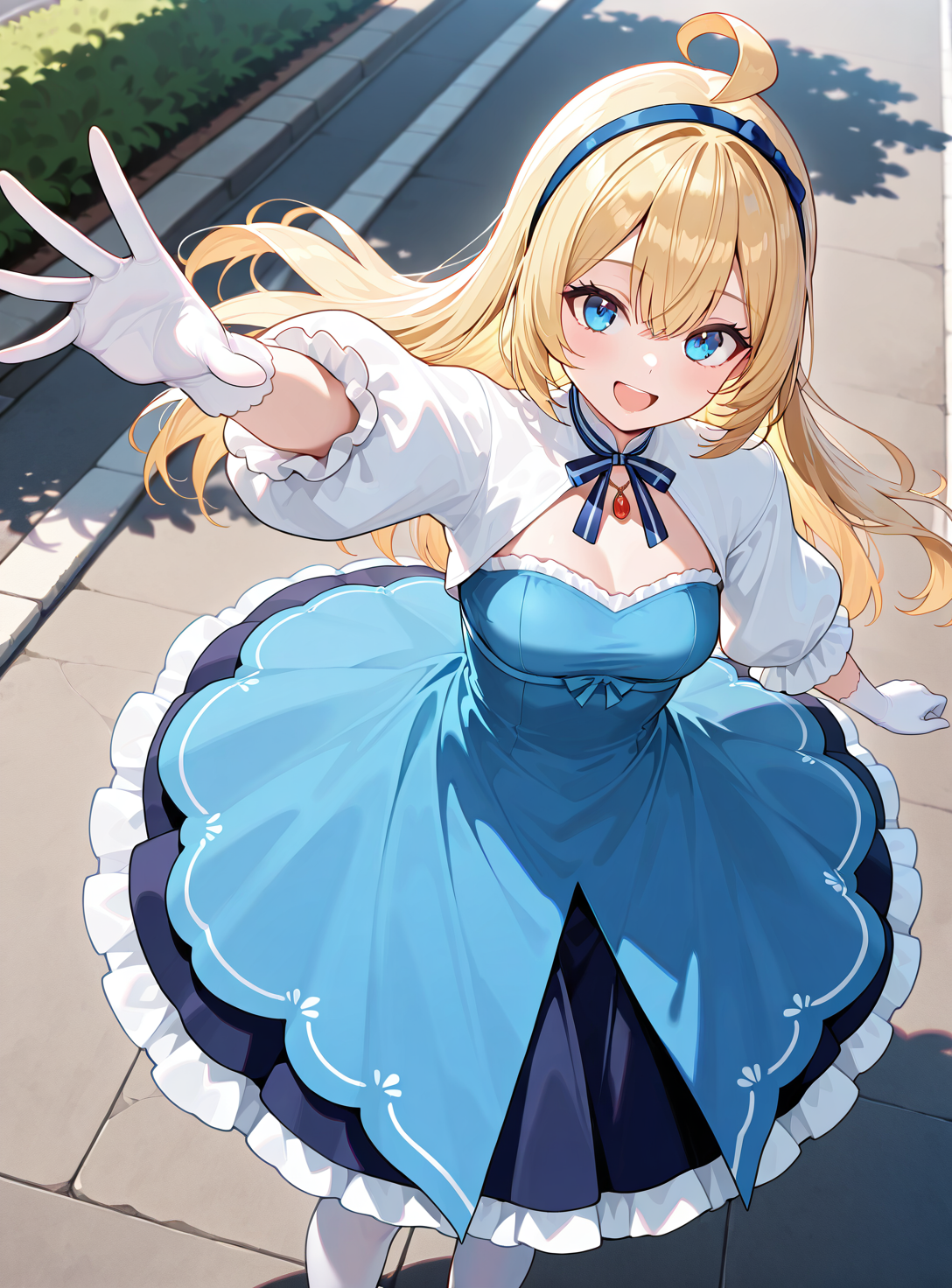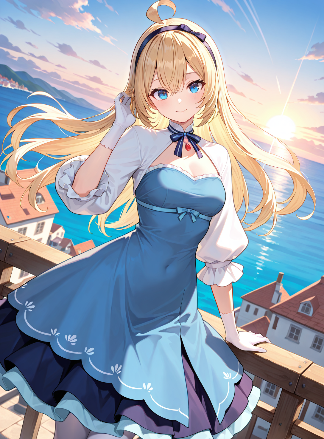 "red pendant, blue neck ribbon, puffy sleeves shrug, layered dress,"