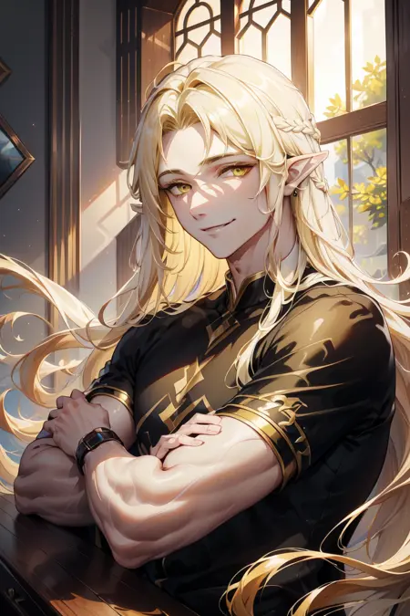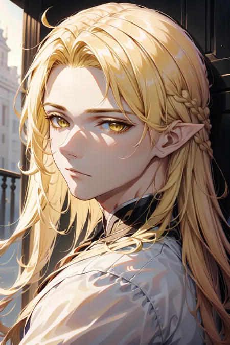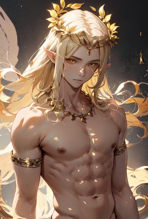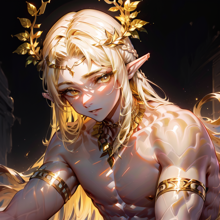 1boy, platinium blonde hair, long hair, yellow eyes, pointy ears, head wreath, golden necklace, armlet,