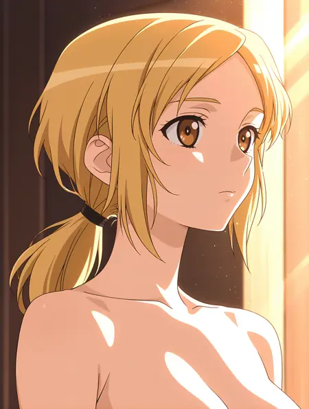 sw-norah、茶色の目、金髪、低めのポニーテール、サイドロックス、分け目のある前髪