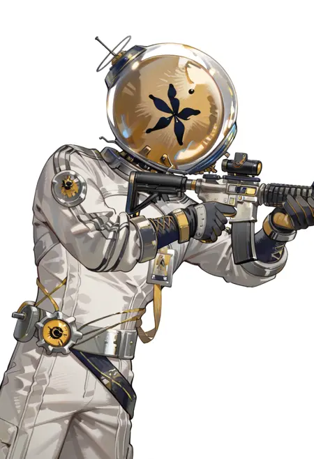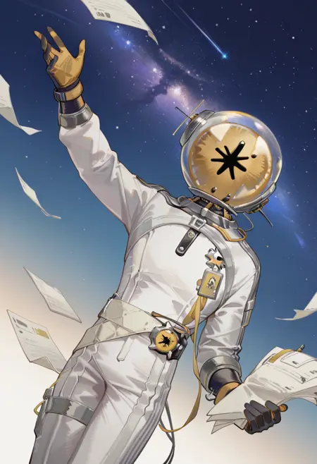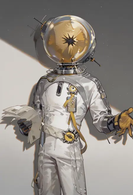 白いジャケット、IDカード、紙、宇宙ヘルメット、手袋、白いシャツ