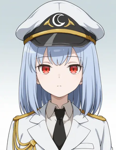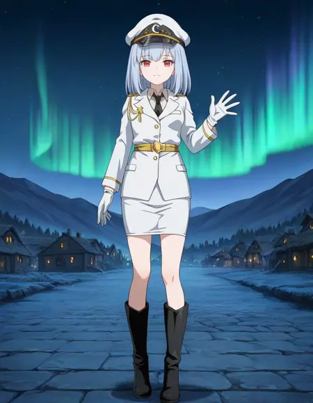 뾰족 모자, 모자에 초승달 문양, 군복, 흰 재킷, 칼라 셔츠, 검은 넥타이, 어깨장식, 에기유렛, 긴 소매, 흰 장갑, 벨트, 연필 치마, 검은 무릎 부츠