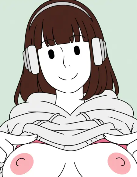 furimagirl, mob face, brown hair, medium hair, blunt bangs, white skin, white headphones, white hoodie, hood down, blue skirt, miniskirt, white socks