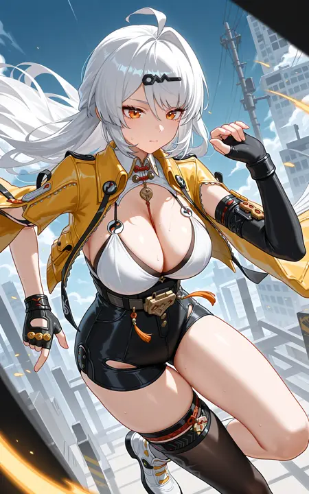 가슴 부분, 큰 가슴, 노랑 재킷, 검은 장갑, 손가락 없는 장갑, 한쪽 장갑, 한쪽 팔꿈치 장갑, 한쪽 허벅지 긴 양말, 비대칭 하의, 검은 숏팬츠, 흰 신발,