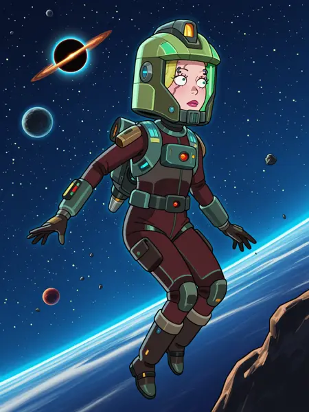 nmspacebeth, 1girl, scar, eyebrow piercing, spacesuit, helmet, green visor, jetpack, gloves, boots