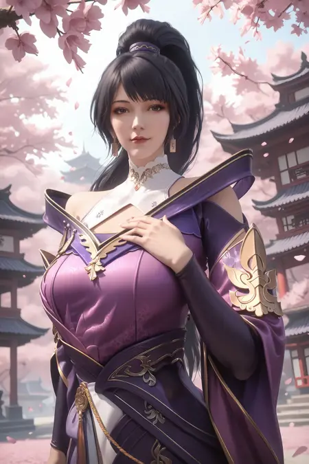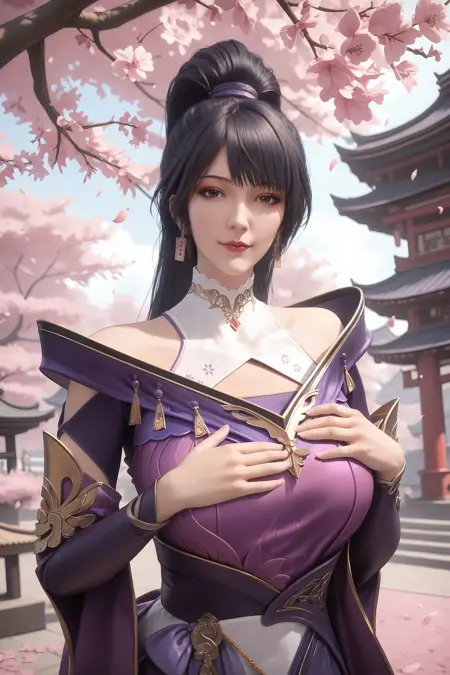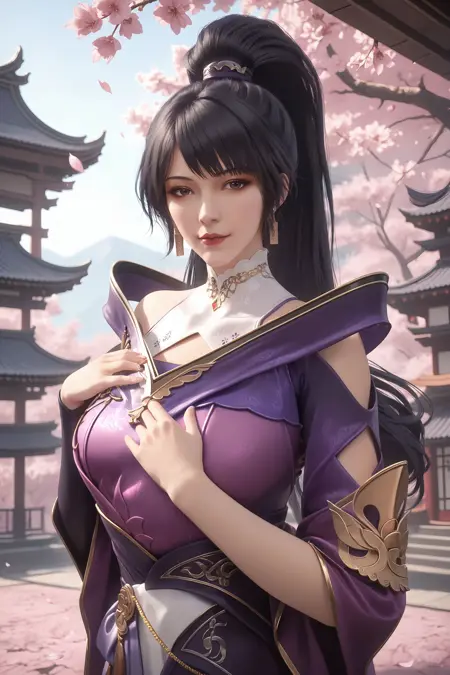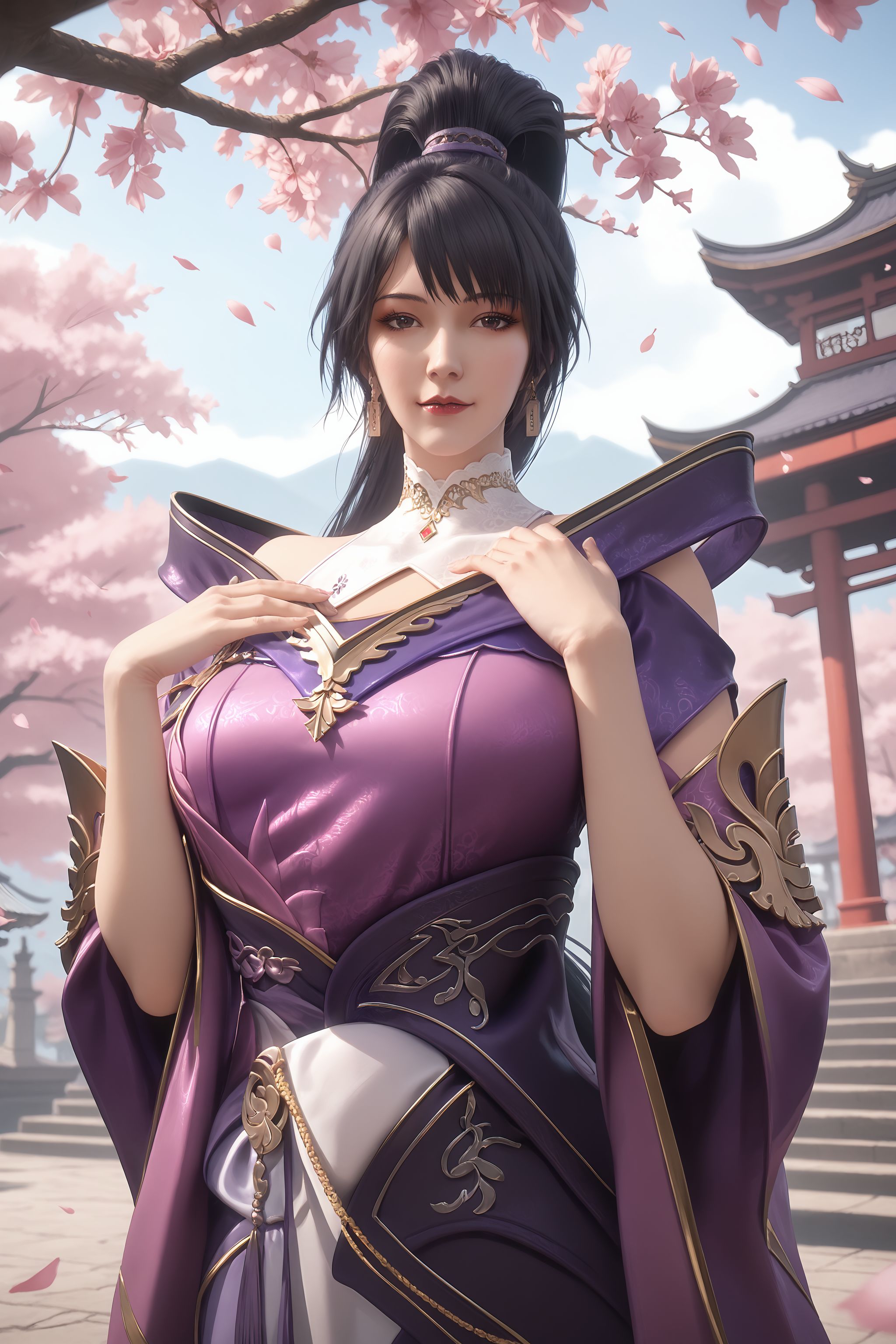 1girl, solo, ponytail, upper body, purple dress, jewelry, black hair, long hair, dress, earrings,