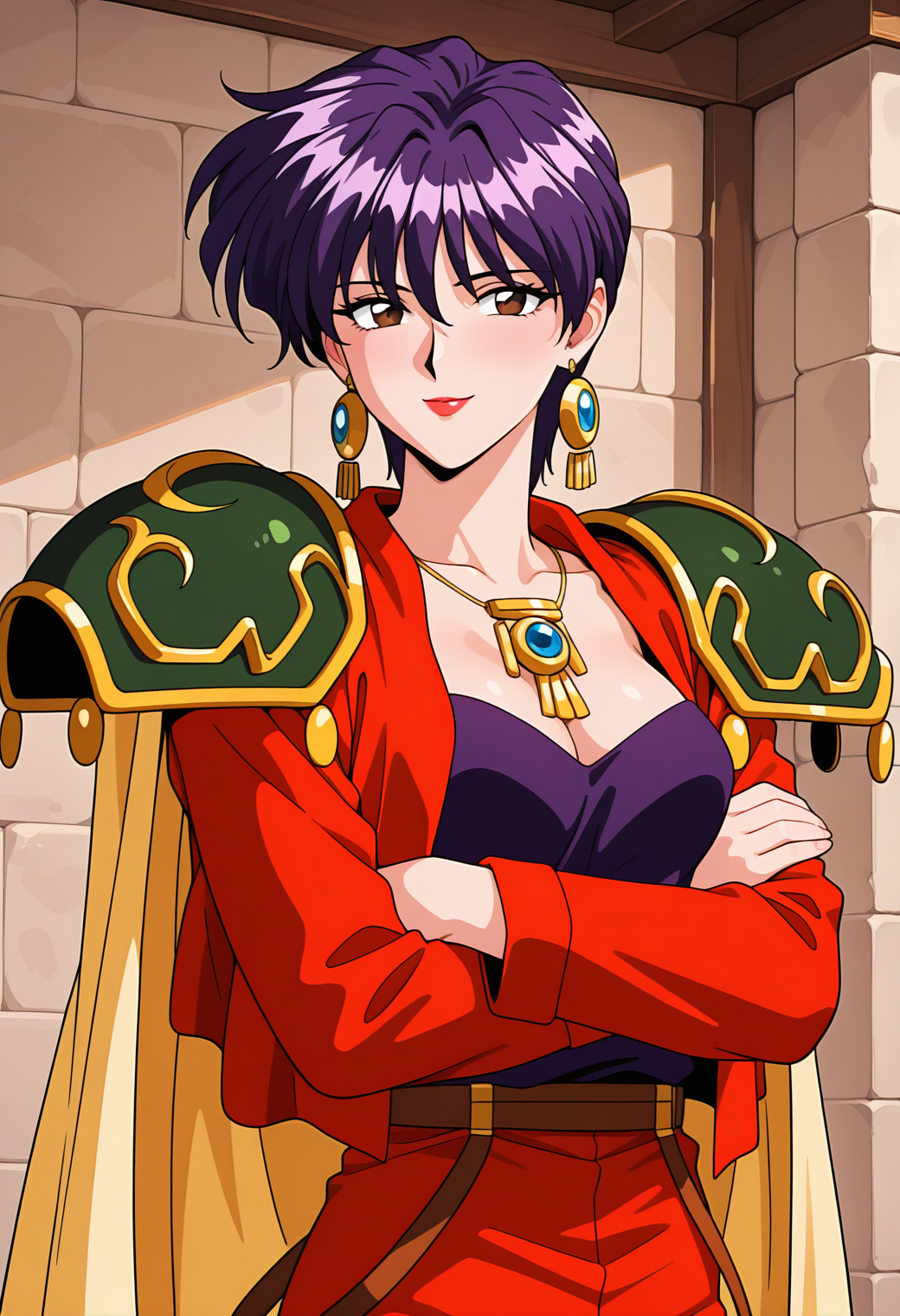 耳环,肩甲,黄色斗篷,红色夹克,长袖,项链,紫色吊带背心,无肩带,腰带,红色长裤,紫色袜子,棕色绑带高跟鞋