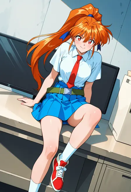 blue hair ribbon, school uniform, collared shirt, short sleeves, red necktie, belt, blue miniskirt, plated skirt, white socks, red footwear