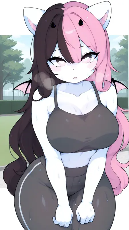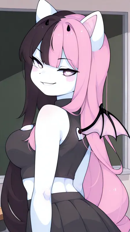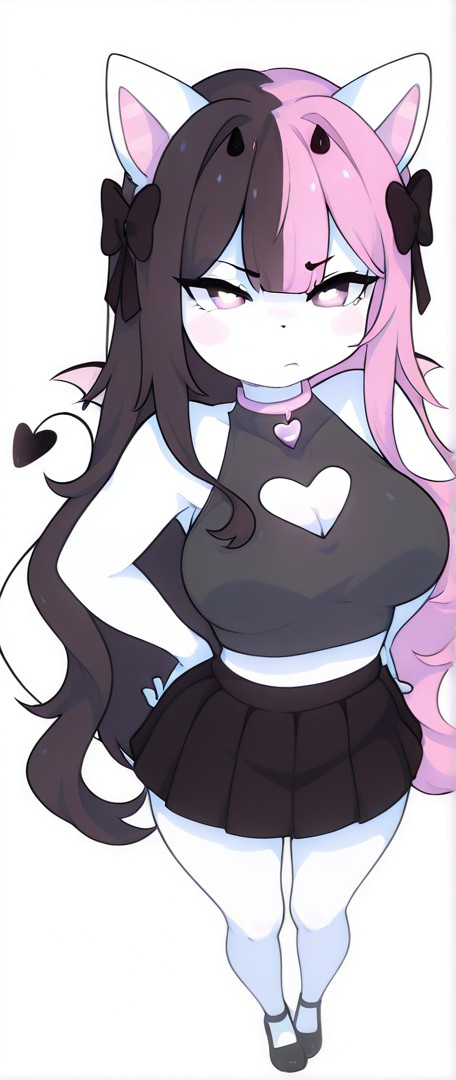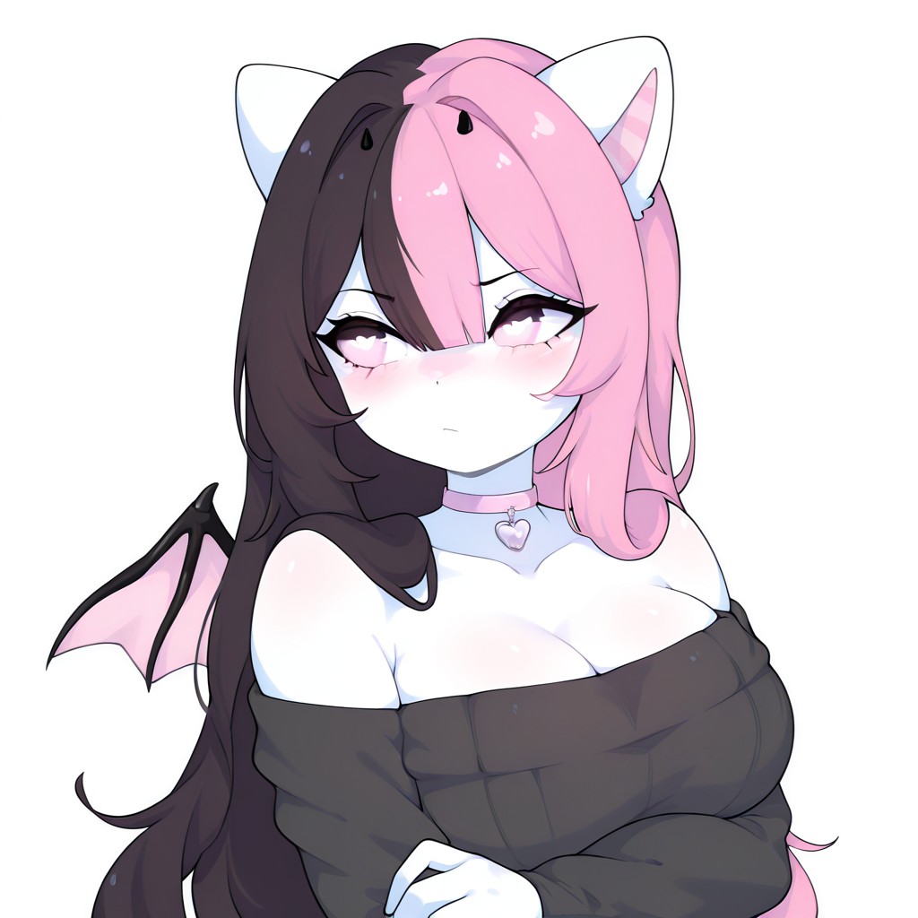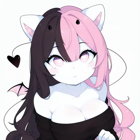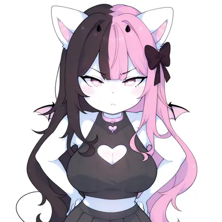 推荐提示词: Angel, 1girl, 分色头发,多色头发,黑粉发色,白皮肤,心形瞳孔,淡红晕