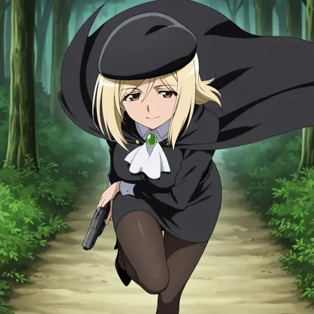 black beret,green jewery,ascot,black cape,black dress,black pantyhose,black heels