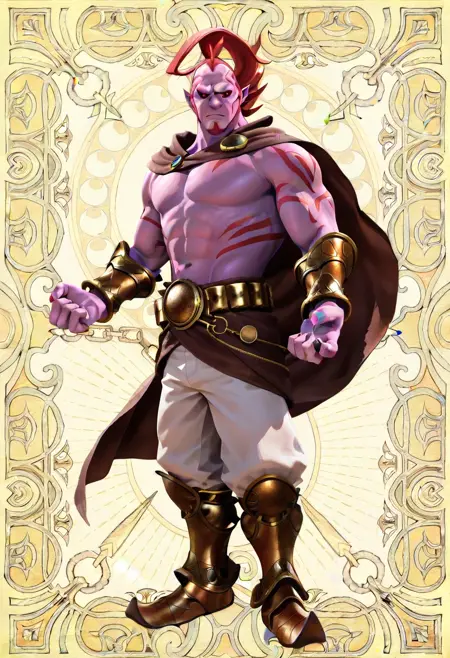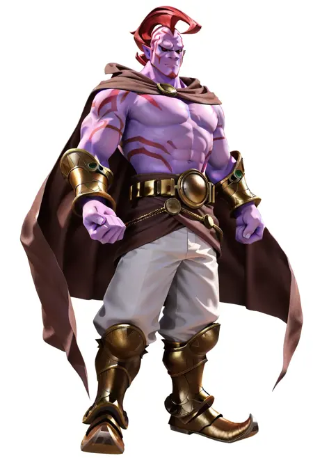 | トレーニングワード | ErazorDjinn, 1boy, tall, muscular, purple skin, intricate red markings on arms, sharp features, flowing red hair, ornate outfit, white pants, gold armored boots, detailed gold belt, dark brown cape, red eyes, black sclera, dark red goatee,コピーしました! |