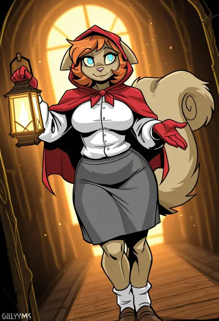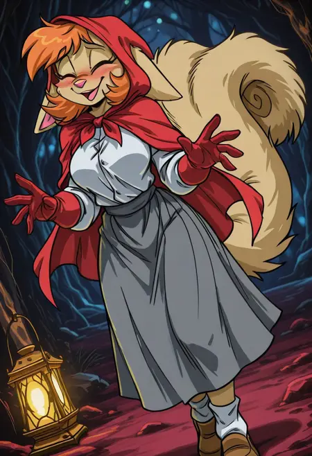 GillyMS、1人の少女、一人、フューリーな女性、アンスロ、茶色い毛、色付きの肌、動物の耳、オレンジ色の髪、前髪、青い目、ピンクの鼻先、大きな胸、太ももが太い、大きなふわふわした尾、赤いフード、白いシャツ、赤いマント、灰色のスカート、白い靴下、茶色い靴、赤い手袋、提灯