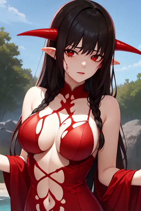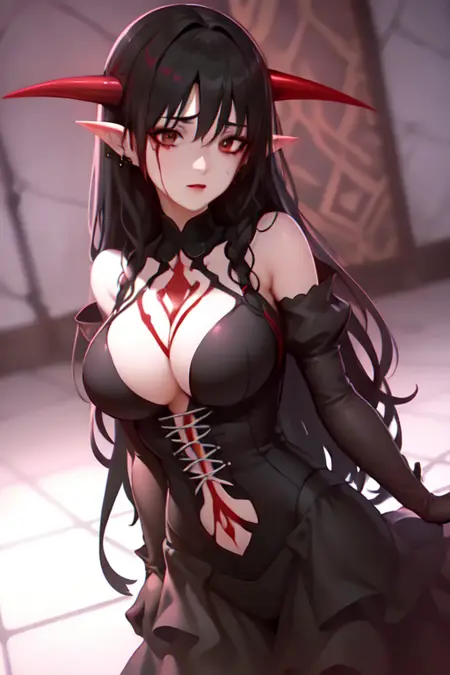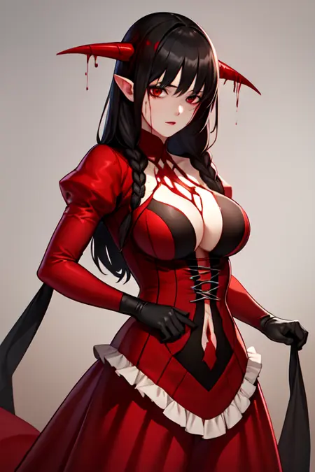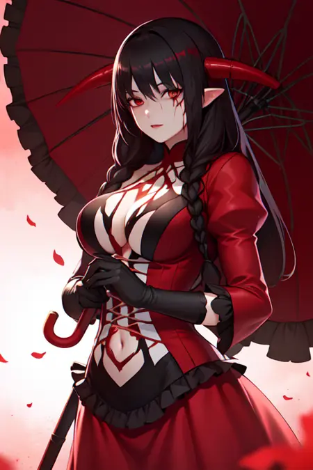 要调用此角色,请输入:lora:Bloodessv3:strengthBloodless, 血红长裙, 角, 黑色手套。此外,若要让她手持雨伞,可额外添加提示词:holding parasol。