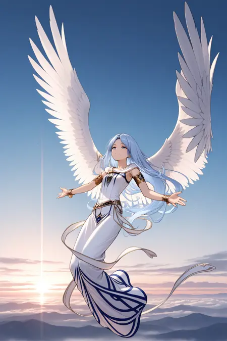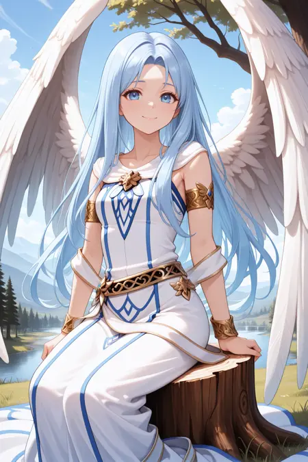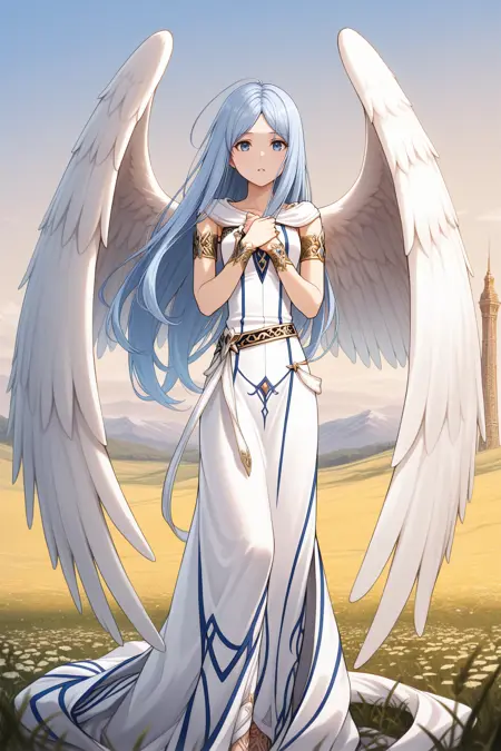要表现《伊苏起源》形象,请添加:“orgfn, 非常长的头发, 浅蓝色头发, 蓝色眼睛, 分开的刘海, 蓝色眼睛, 羽毛翅膀, 白色翅膀, 白色长裙, 蓝色条纹, 长裙, 金色臂环, 手镯, 金色腰带, 白色丝带”。