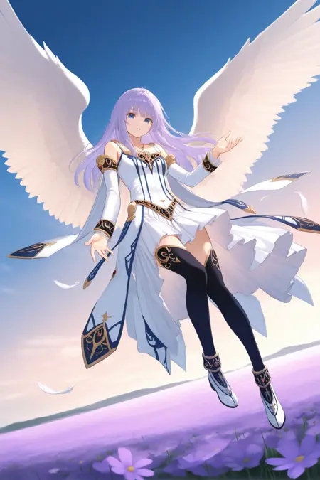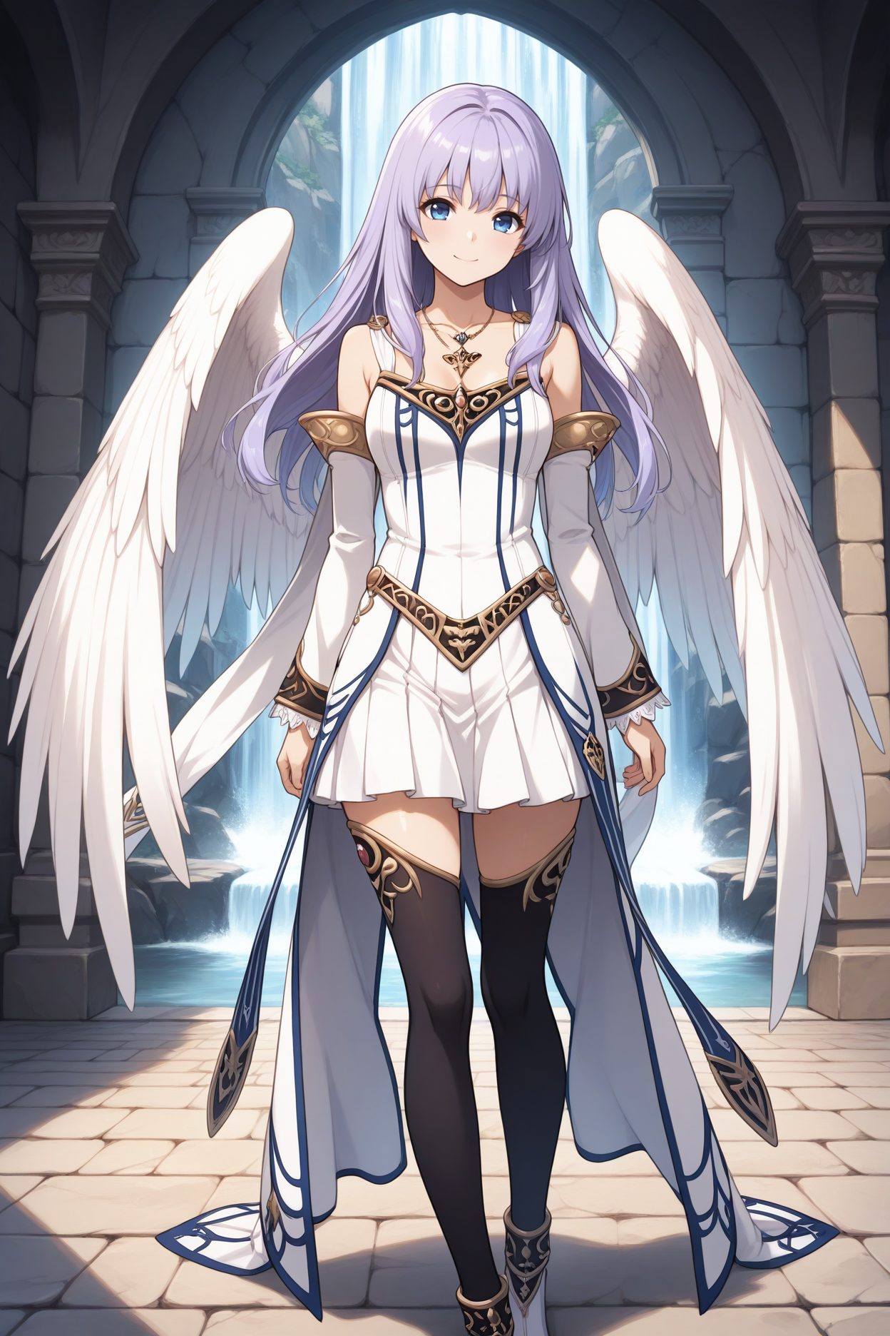 为她的《伊苏起源》形象添加:“agreah, 浅紫色头发, 长发, 蓝色眼睛, 白色翅膀, 羽毛翅膀, 白色连衣裙, 金色镶边, 项链, 露肩, 蓝色条纹, 分离袖子, 白色袖子, 白色裙摆, 百褶裙, 黑色过膝袜”。