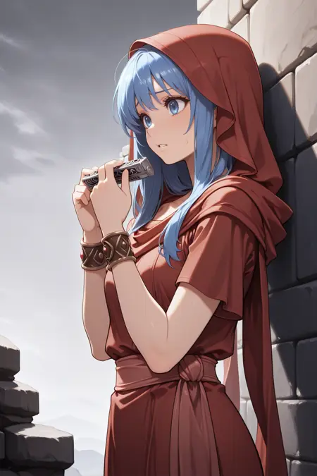 为她的《伊苏I》形象添加:“ysreah, 蓝色头发, 长发, 侧发, 蓝色眼睛, 红色长袍, 红色围巾, 短袖, 帽子戴起, 红色腰带, 手镯”。