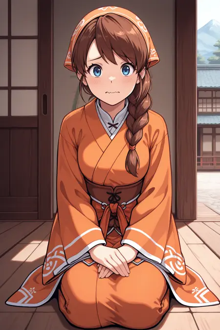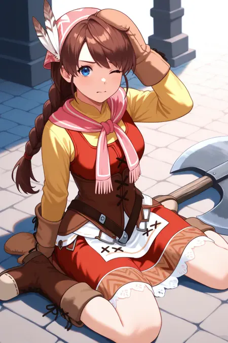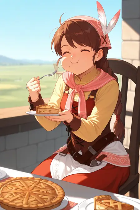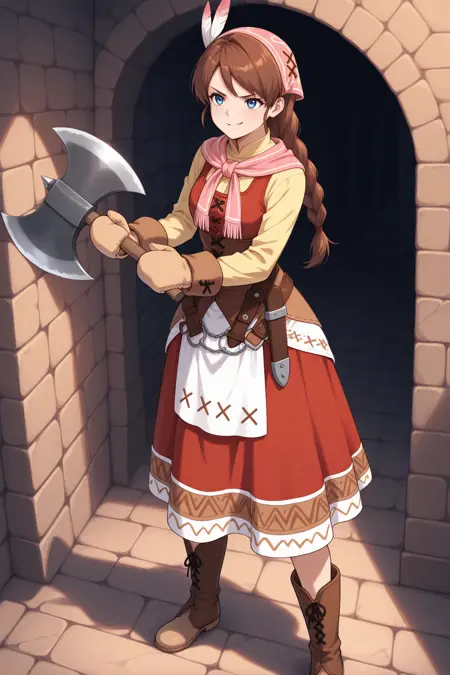 그녀의 전형적인 외모를 위해 "밴다나, 깃털 머리 장식, 분홍색 스카프, 노란색 셔츠, 긴 소매, 빨간 드레스, 갈색 언더버스트, 흰색 앞치마, 허리 앞치마, 벨트, 갈색 장갑, 갈색 부츠"를 추가하세요.