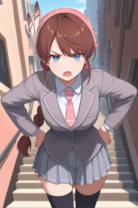 Add "bandana, feather hair ornament, pink scarf, yellow shirt, long sleeves, red dress, brown underbust, white apron, waist apron, belt, brown mittens, brown boots" for her typical look.