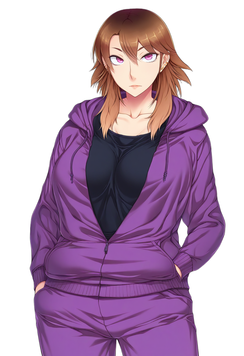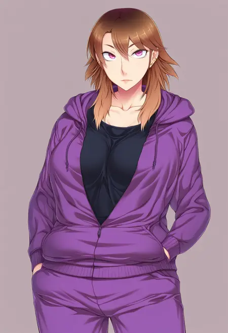 服饰: 紫色连帽衫、长袖、黑色上衣、紫色长裤,