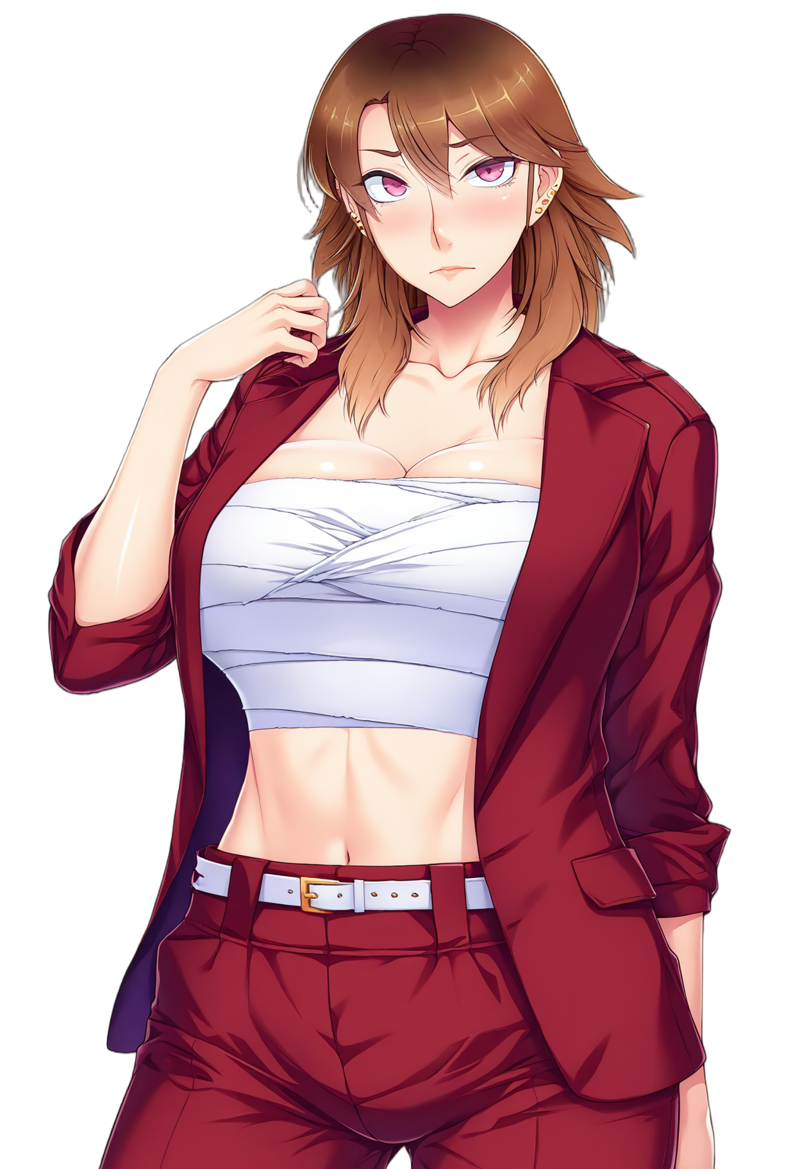 服饰: 红色夹克、胸部缠带、长袖、红色长裤、白色腰带,