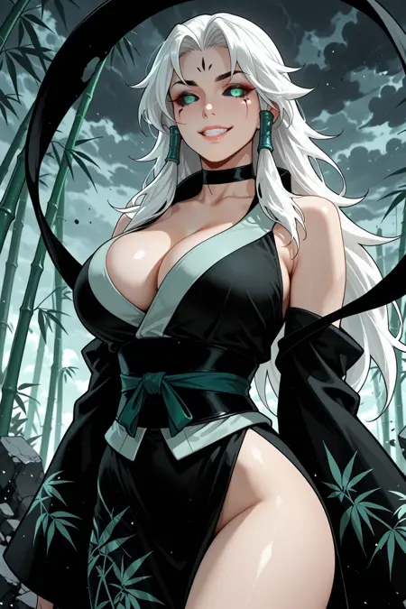 Trigger Zombie : SprtLrd, demon, long hair, white hair, curtained hair, forehead mark, colored sclera, black sclera, green pupils, facial Tattoo, side braids, hair tubes, choker, halterneck, black shawl, cleavage, detached sleeves, japanese clothes, bamboo print, wide sleeves, obi, side slit, stitched leg