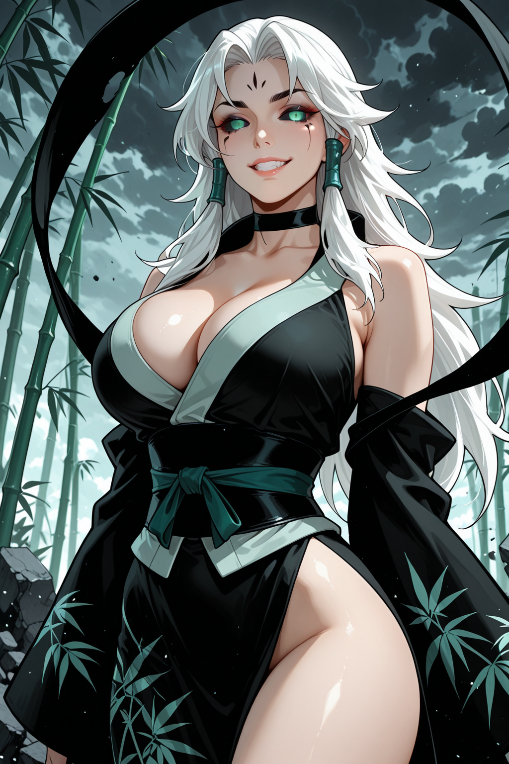 触发词僵尸:SprtLrd,恶魔,长发,白发,遮面长发,额印,彩色虹膜,黑色虹膜,绿色瞳孔,面部纹身,侧边编发,发管,项圈,吊颈装,黑色披风,露胸, detach sleeves,日式服饰,竹纹,宽袖,腰带,侧开衩,缝合腿