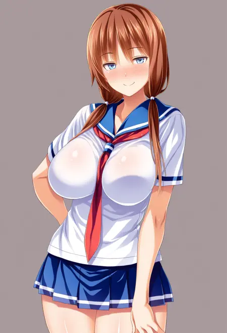 Clothing: serafuku, blue sailor collar, short sleeves, red necktie, blue skirt, pleated skirt, untucked shirt,