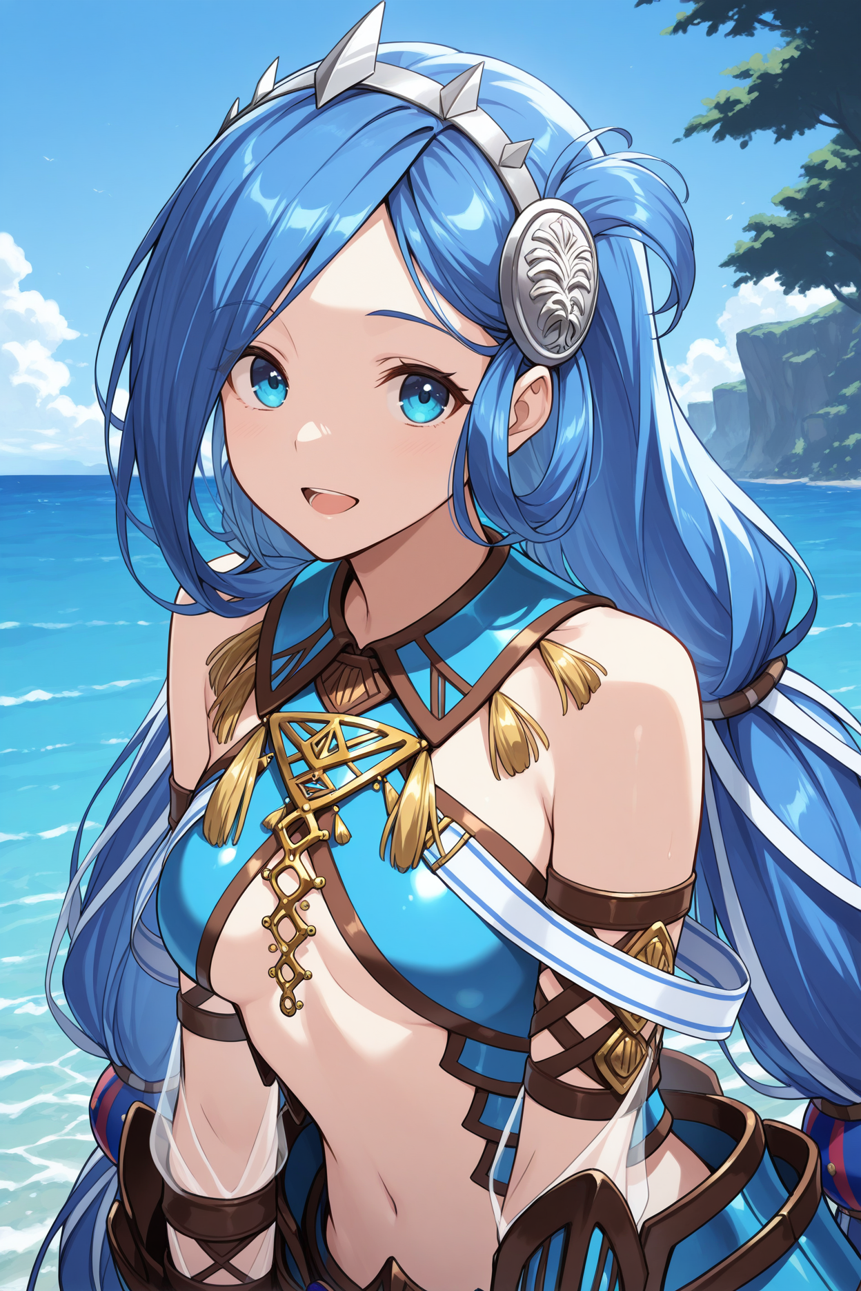 그녀의 전형적인 외모를 위해 "머리 장식, 헤어밴드, 드러나는 옷차림, 파란 갑옷, 흰 끈, 어깨 노출, 아랫가슴 노출, 복부 노출, 털 달린 장식, 금 장신구, 팔찌, 투명한 소재, 손가락 없음 장갑, 겉갑, 투명한 하의"를 추가하세요.