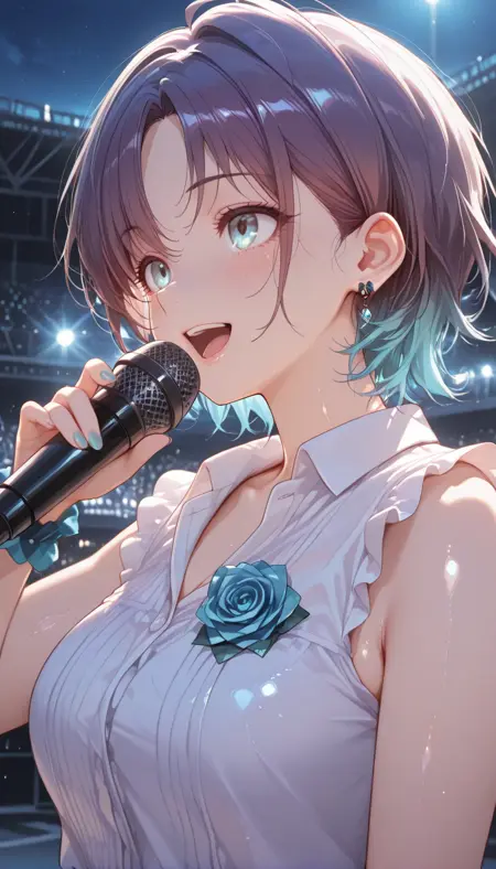 IMAsakuraToru, breasts, short hair, brown hair, blue hair, ahoge, purple hair, multicolored hair, earrings, two-tone hair, parted bangs, gradient hair, piercing, ear piercing,