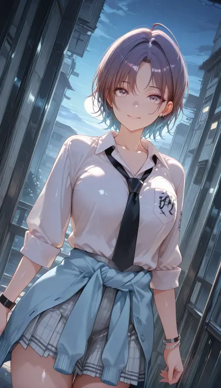 shirt, skirt, long sleeves, jewelry, jacket, school uniform, collarbone, white shirt, pleated skirt, necktie, collared shirt, miniskirt, sweater, bracelet, plaid, plaid skirt, cardigan, black necktie, wristband, grey skirt, sleeves rolled up, pocket, shirt tucked in, breast pocket, clothes around waist, open collar, loose necktie, jacket around waist, blue cardigan, sweater around waist, cardigan around waist,